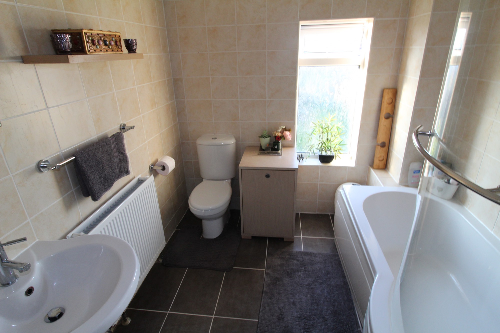 Bathroom 9’3 x 6’11 (2.82m x 2.13m) Double glazed frosted window to rear, P shaped bath with shower, low level W/C, wash hand basin, fully tiled walls, ceramic tiled flooring, heated towel rail
