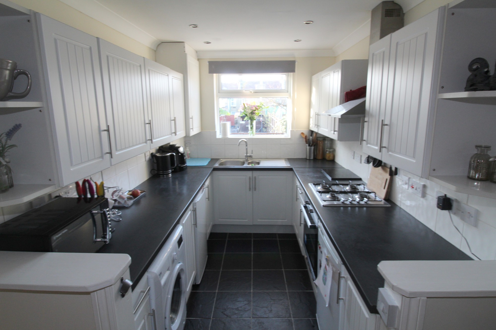 Kitchen 10’8 x 5’11(3.26m x 1.81m) Double glazed window to rear, range of wall and base units, 1 ½ bowl stainless steel sink, oven with hob and extractor over, space and plumbing for washing machine, dish washer and tumble dryer, space for fridge freezer, ceramic tiled flooring.